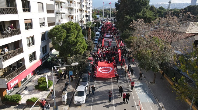 Devrimci İşçi Sendikaları Konfederasyonu (DİSK) Genel-İş Sendikası İzmir şubelerine üye işçiler, vergide adalet ve asgari ücrete yönelik taleplerini dile getirmek için sahaya indi. Düzenlenen yürüyüşe İzmir Büyükşehir Belediye Başkanı Tunç Soyer, DİSK Genel Başkanı Arzu Çerkezoğlu, Genel İş Genel Başkanı Remzi Çalışkan, DİSK Ege Bölge Temsilcisi Memiş Sarı, sendika yöneticileri, sivil toplum örgütleri ve işçiler katıldı. Montrö Meydanı’ndan ellerinde döviz ve pankartlarla Cumhuriyet Meydanı’na kadar yürüyen işçiler, “Zafer direnen emekçinin olacak”, “Birleşe birleşe kazanacağız” sloganları attı. İşçiler ayrıca asgari ücrete yönelik zam taleplerinin dikkate alınmamasına, taşıdıkları temsili bir tabutla tepki gösterdi.