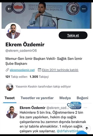 TEMİZELLER ‘in ele geçirdiği belgelerde, Sağlık-Sen İzmir 2 Nolu Şubesi başkanı Ekrem Özdemir 2021 yılında twitter üzerinden yaptığı paylaşıma Cumhurbaşkanı Recep Tayyip Erdoğan ve Sağlık Bakanını da etiketleyerek ‘ Hekimlere 5 bin lira, öğretmenlere 2 bin lira zam yapılırken hekim dışı sağlık çalışanlarını bu zammın dışında bırakmak en iyi tabirle “AHMAKLIKTIR” 1 milyon sağlık çalışanı yok sayılamaz’ dediği görüldü.