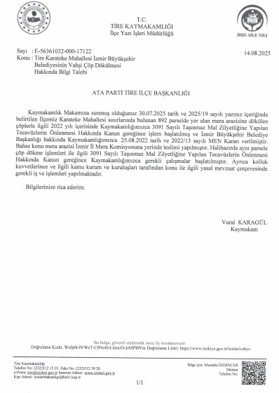 ATA Parti Tire İlçe Başkanlığı, sürecin hem idari hem hukuki hem de siyasi olarak takipçisi olacağını kamuoyuna duyurdu. Önümüzdeki günlerde yapılacak başvuruların ardından elde edilecek bilgiler doğrultusunda yeni adımlar atılması bekleniyor.