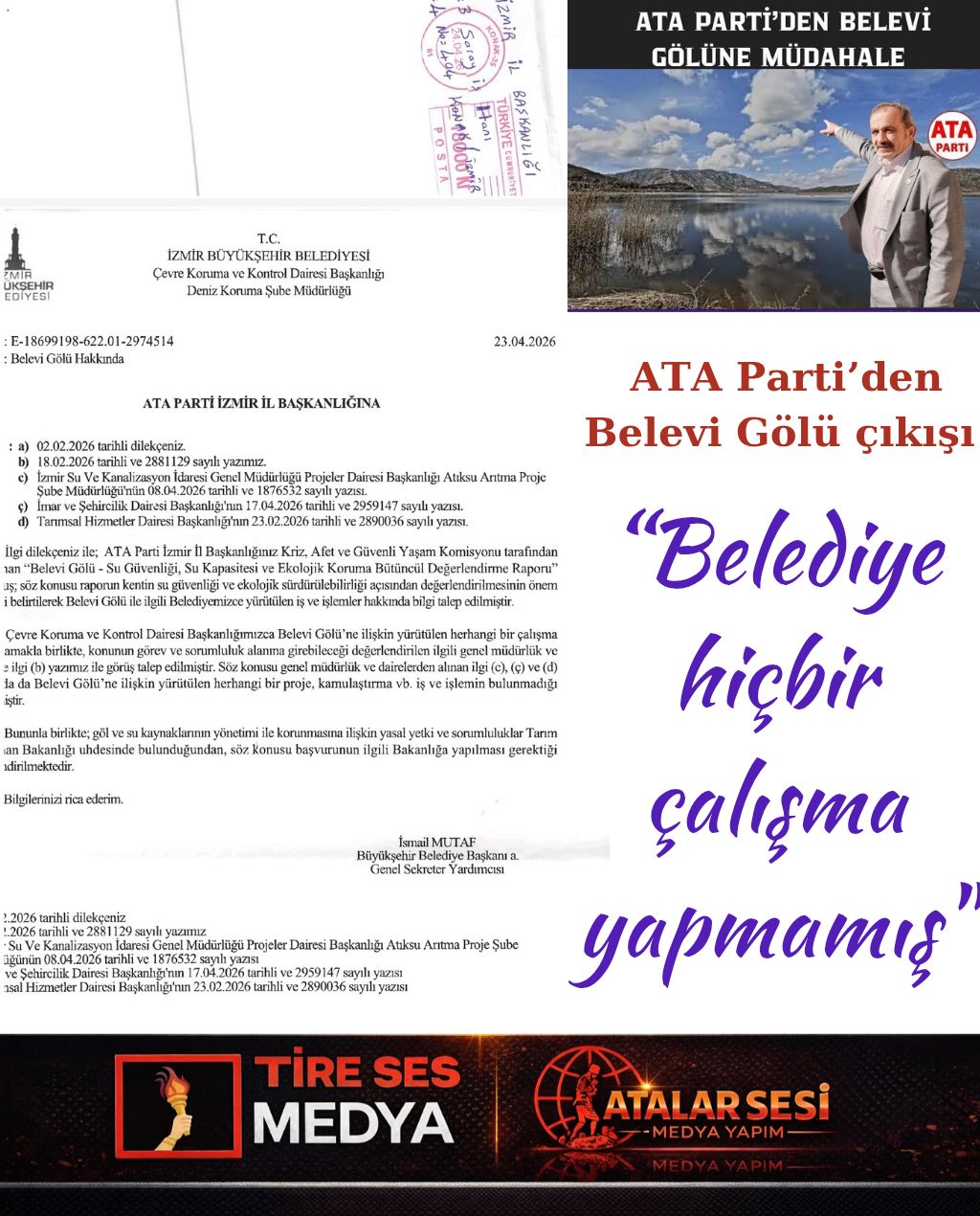 İlbey KARA “Belediye hiçbir çalışma yapmamış” İZMİR – ATA Parti İzmir İl Başkanlığı’nın Belevi Gölü ile ilgili yaptığı resmi başvuruya İzmir Büyükşehir Belediyesi’nden gelen yanıt, kentte yeni bir tartışmanın..