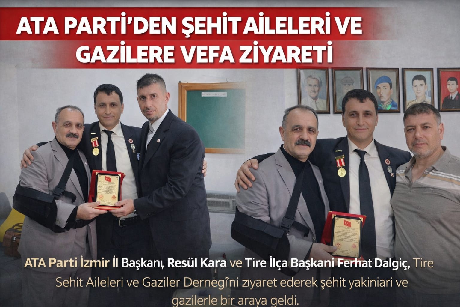 ATA Parti İzmir İl Başkanı Resül Kara ve Tire İlçe Başkanı Ferhat Dalgıç, beraberlerindeki parti heyetiyle Tire Şehit Aileleri ve Gaziler Derneği’ni ziyaret ederek şehit yakınları ve gazilerle bir araya geldi.
