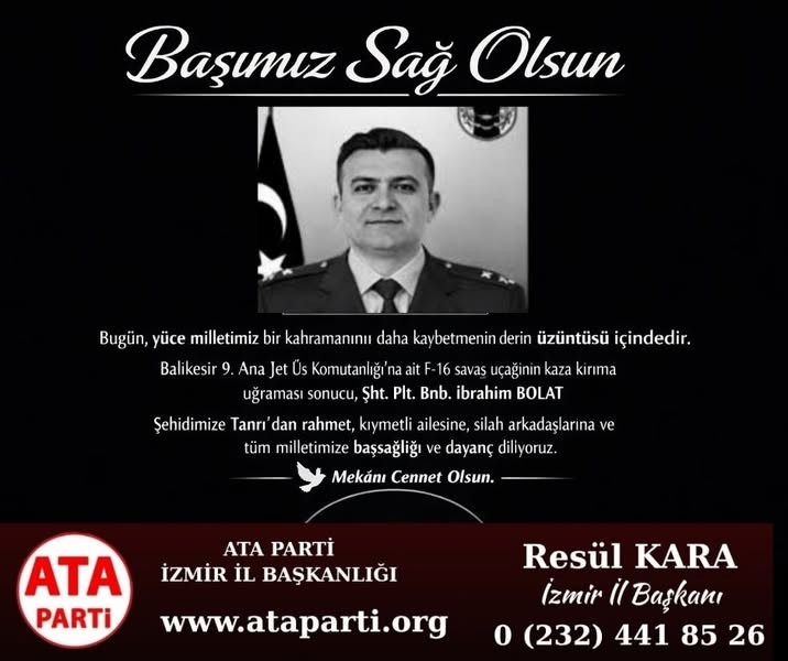 Bugün, yüce milletimiz bir kahramanını daha kaybetmenin derin üzüntüsü içindedir. Balıkesir 9. Ana Jet Üs Komutanlığı’na ait F‑16 savaş uçağının kaza kırıma uğraması sonucu, Hava Pilot Binbaşı İbrahim BOLAT şehit..