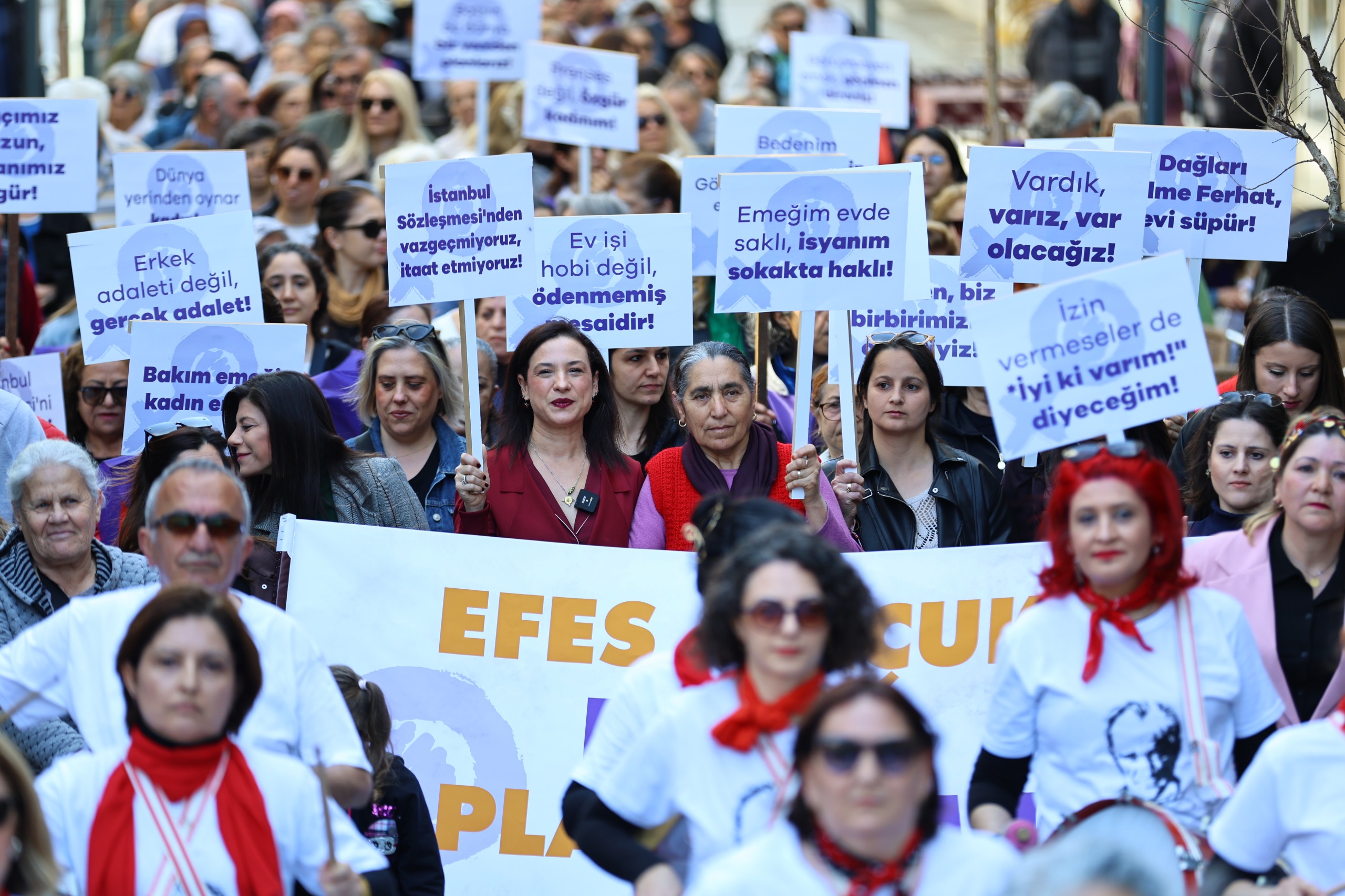 Efes Selçuk Belediyesi ile Efes Selçuk Kadın Platformu iş birliğinde düzenlenen 8 Mart Dünya Emekçi Kadınlar Günü etkinlikleri kapsamında kadınlar, Efes Selçuk Belediyesi Kadın Bando Takımı eşliğinde yürüyüş gerçekleştirdi. İstasyon Meydanı’ndan başlayan yürüyüşe Efes Selçuk Belediye Başkanı Filiz Ceritoğlu Sengel, CHP İlçe Başkanı İpek Onbaşıoğlu, belediye meclis üyeleri, sendika temsilcileri ve çok sayıda Efes Selçuklu kadın katıldı.