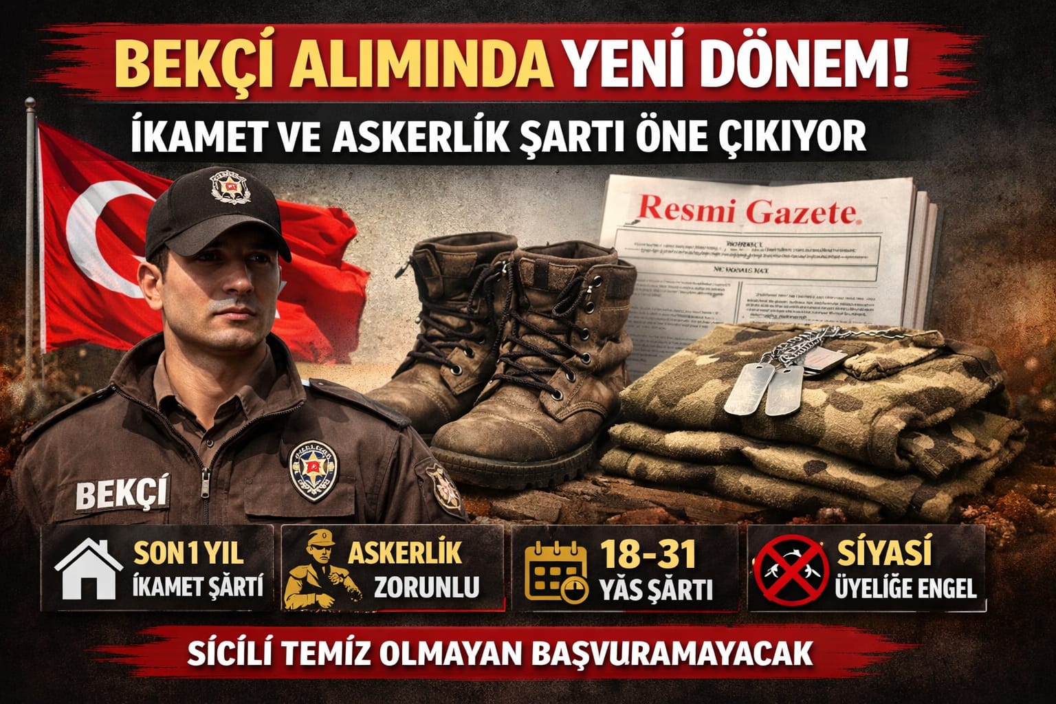 Bekçi alımlarında yaş aralığı 18 ila 31 olarak yeniden belirlendi.Adayların en az lise mezunu olması ve Türkiye Cumhuriyeti vatandaşı olma şartı ise korunmaya devam ediyor.