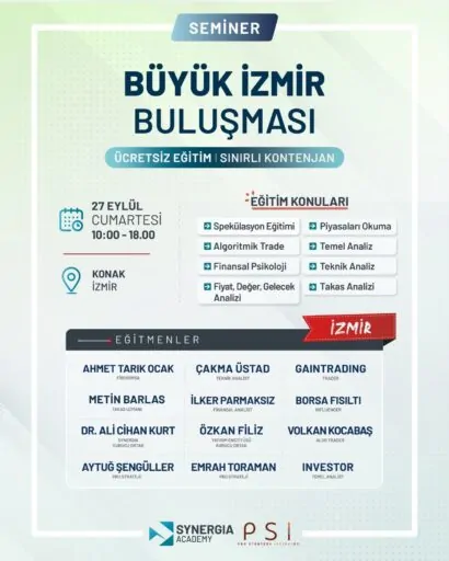 27 Eylül’de yatırım dünyasının önde gelen uzmanları İzmir’de bir araya geliyor! Spekülasyon eğitiminden algoritmik trade ve teknik analize; piyasa okuma ve takas analizinden temel analize; finansal psikolojiden fiyat, değer ve..
