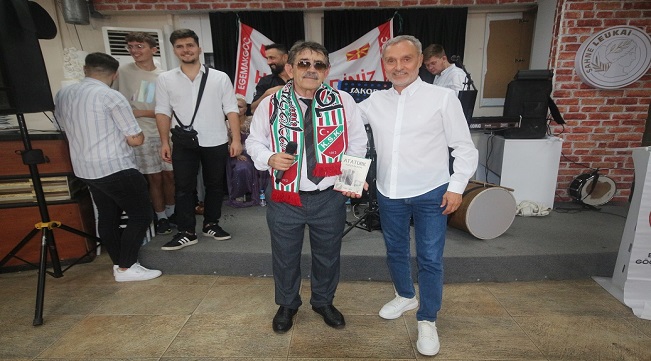 Diker Uzunkaya’ya Kaf Kaf’ın atkısını takarken kaleme aldığı “Atatürk Karşıyaka’da” adını verdiği kitabını armağan etti…