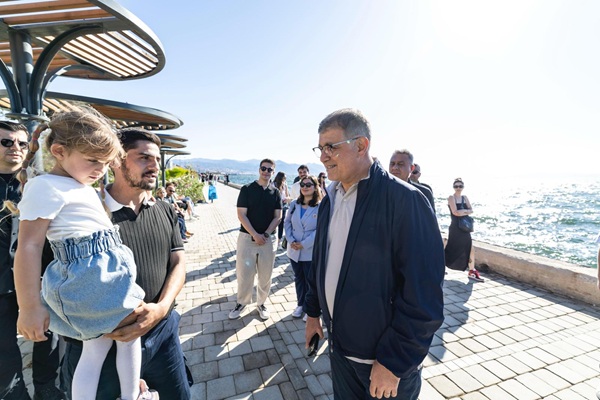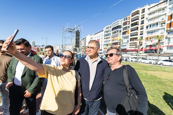 Başkan Tugay Kordon’da yürürken yanında gelen yurttaşlarla da sohbet ederek hatıra fotoğrafı çektirdi. Şampiyonluğa oynayan Galatasaray’ın maçını seyretmek için Kordon’da bulunan Galatasaray formalı baba ve kızına başarılar dileyen Başkan Tugay, miting için Denizli’den gelen bir aile ile de konuştu.