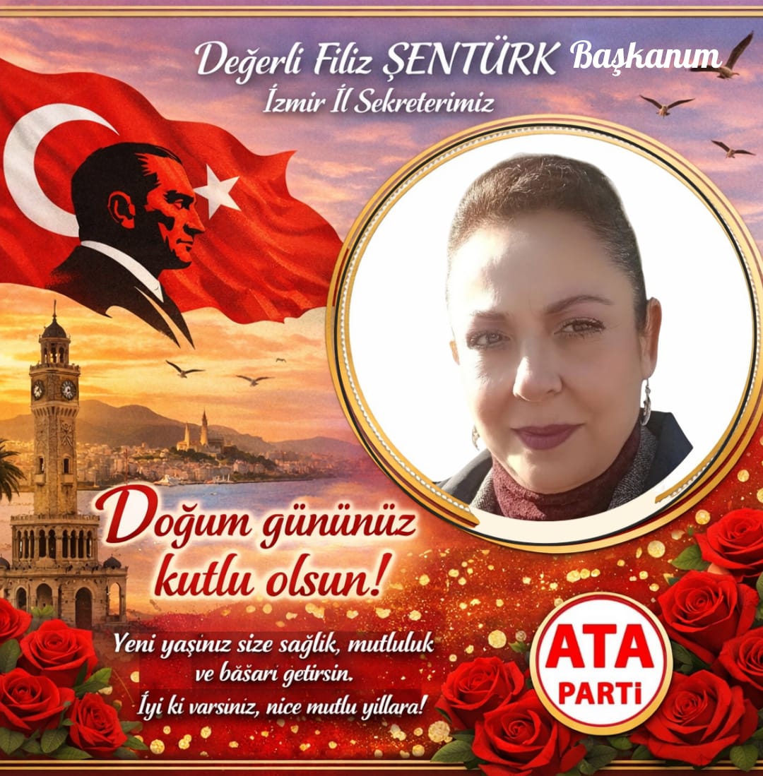 Partimizin İl Başkan Vekili ve İl Sekreteri olarak büyük bir özveriyle görev yapan çok değerli Filiz ŞENTÜRK Başkanımızın ad gününü en içten dileklerimizle kutluyoruz. ATA ailesi çatısı altında, Cumhuriyetimizin kurucu değerlerine bağlı kalarak; laik, demokratik, adil ve tam bağımsız bir Türkiye hedefi doğrultusunda aynı yolda omuz omuza yürümekten onur ve gurur duyuyoruz. İnancınız, emeğiniz ve kararlılığınızla verdiğiniz mücadelenin yeni yaşınızda da ülkemize ve partimize güç katmasını diliyor; sağlık, mutluluk ve başarı dolu nice yıllar temenni ediyoruz.