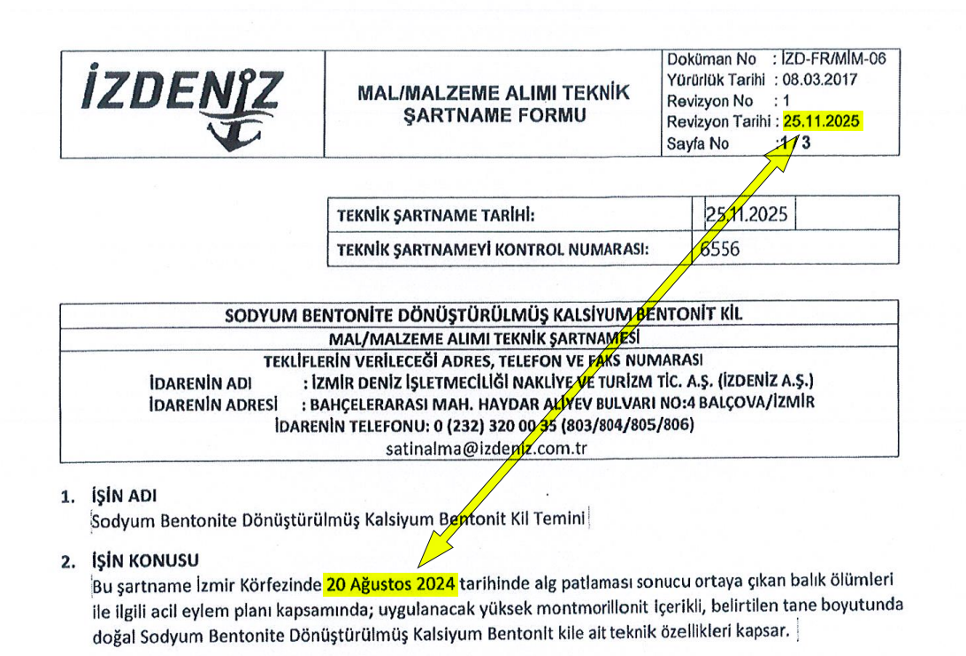 16 Aylık “Acil” Bekleyiş: Şartnamenin 2. maddesinde, işin konusu “20 Ağustos 2024 tarihindeki balık ölümleri ile ilgili acil eylem planı” olarak tanımlanmıştır. Ancak aynı belgenin kapak sayfasında revizyon ve imza tarihi 25.11.2025 olarak görülmektedir. İzmir Körfezi kokudan kırılırken, ekosistem can çekişirken parmağını oynatmayanlar; “acil” dedikleri müdahale için tam 16 ay (460 gün) beklemiştir. Bu durum, ihalenin bir ihtiyaçtan ziyade, belirli bir stokun eritilmesi için “vakti gelmiş bir operasyon” olduğu şüphesini zirveye taşımaktadır.