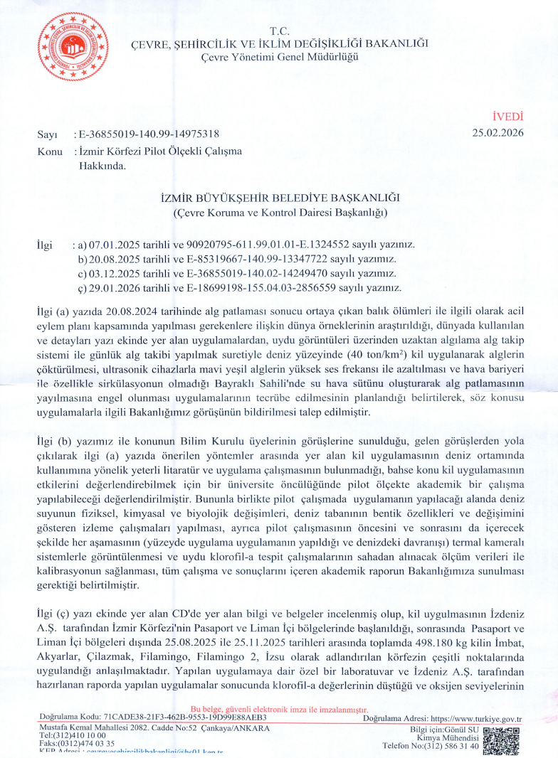 Çevre, Şehircilik ve İklim Değişikliği Bakanlığı’nın TEMİZELLER tarafından ele geçirilen 25.02.2026 tarihli resmi yazısı, İZDENİZ ‘in liyakatsiz yönetimini adeta suçüstü yakaladı. Bakanlık, bilimsel verileri toplamak adına sadece Bayraklı açıklarında ve son derece dar bir alanda “pilot ölçekli çalışma” yapılmasına şartlı izin vermişken, İZDENİZ yönetimi bu izni suistimal ederek İzmir Körfezi’ni resmen deneme tahtasına çevirdi. Bakanlık onayı olmadan hareket eden liyakatsiz kadroların; Pasaport, Liman İçi, İmbat, Akyarlar, Çilazmak, Filamingo ve İZSU sahaları olmak üzere körfezin tam 7 farklı stratejik noktasına, yaklaşık 500 TON (498.180 kg) kili hiçbir bilimsel dayanak olmadan “kaçak döküm” gibi boşalttığı tescillendi.