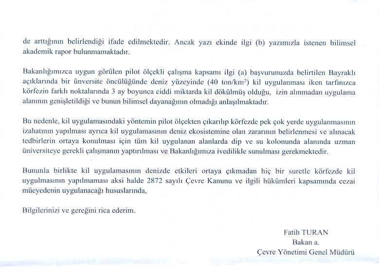 Rapora göre, dökülen bu yüzlerce ton kil algleri yok etmiyor, sadece denizin dibine hapsediyor. Dibe çöken bu devasa atık kütlesi orada çürümeye başlayarak sudaki oksijeni tamamen bitiriyor ve deniz dibindeki yaşamı adeta boğarak katlediyor. Profesörler şu uyarıyı yapıyor, “Dünyada kullanılan ileri teknoloji ürünü “mıknatıs” etkili modifiye killer yerine, bildiğimiz kedi kumu özellikli doğal killeri dökerek İzmir Körfezi’nin geleceğine adeta “beton tabut” kapatıyorsunuz! Bilim dışı bu popülist adımlar, körfezi kurtarmak bir yana, ekosistemi geri dönülmez bir felakete sürüklüyor.”