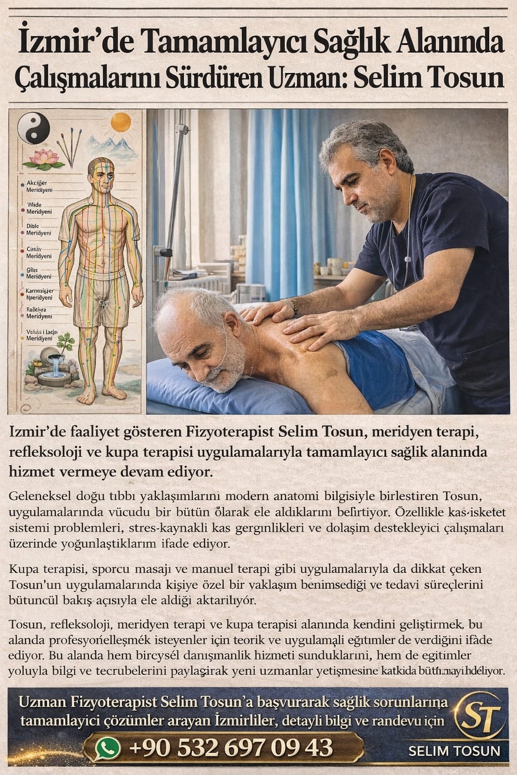 İzmir, tamamlayıcı ve alternatif sağlık uygulamalarında bilimselliği ön plana çıkaran yeni bir yaklaşıma ev sahipliği yapıyor. Fizyoterapist Selim Tosun, geleneksel Doğu tıbbının binlerce yıllık birikimini, modern anatomi ve fizyoloji bilgisiyle harmanlayarak İzmir’deki danışanlarına sunuyor.