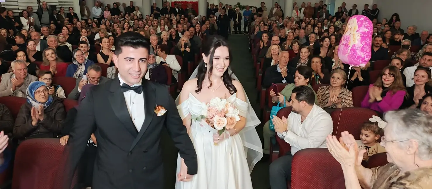 NHABERİZMİR/Aydan YALÇIN – Karşıyaka’nın tanınan isimlerinden Makedonya Göçmenleri Derneği Genel Başkanı Kadri Altınkalp’in kızı Fulya Altınkalp ile Merhum İsmail Doğan’ın oğlu Ömer Doğan, Zübeyde Hanım Nikah Sarayı’nda düzenlenen sade ama görkemli bir törenle dünyaevine girdi. Nikahı İzmir Büyükşehir Belediye Başkanı Dr. Cemil Tugay kıydı.