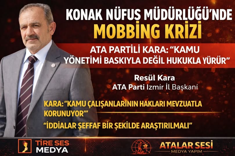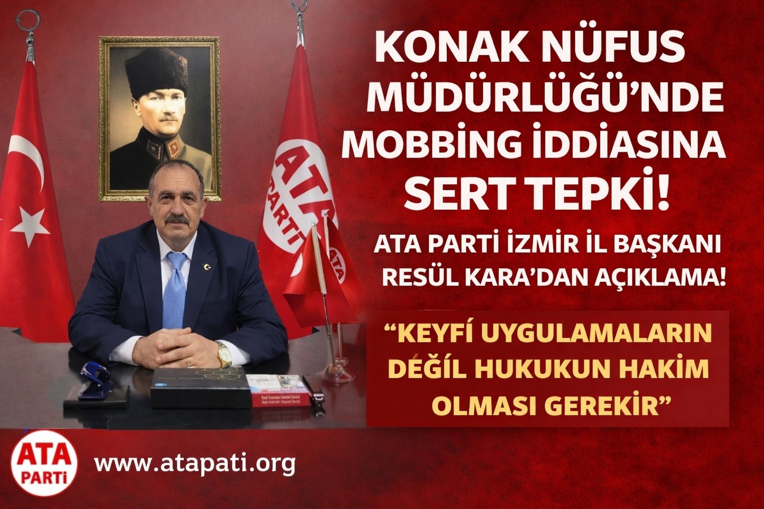 İzmir’de son günlerde bazı basın yayın organlarında yer alan Konak İlçe Nüfus Müdürlüğü’nde çalışan personele yönelik mobbing uygulandığı iddiaları kamuoyunda tartışma yaratırken, konuya ilişkin dikkat çeken bir açıklama ATA Parti İzmir İl Başkanı Resül Kara’dan geldi.