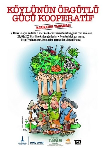 İzmir Büyükşehir Belediyesi “Köylünün Örgütlü Gücü Kooperatif” temasıyla 2’nci kez ulusal karikatür yarışması düzenliyor. Başkan Tunç Soyer’in desteklediği ve kent ile kırsal arasındaki en büyük kopmaz bağ üzerine temellenen kooperatifçilik anlayışı çizgilere konu oluyor. “Köylünün Örgütlü Gücü Kooperatif” Ulusal Karikatür Yarışması için çizerler 21 Mart 2023 tarihine kadar başvuru yapabilecek.