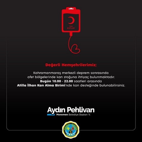 Pehlivan, kan ihtiyacına da dikkat çekerek şöyle devam etti; “Afet bölgelerinde yaralı vatandaşlarımız için kan ihtiyacı da bulunmaktadır. Vatandaşlarımızı saat 10.00 – 22.00 saatleri arasında Atilla İlhan Kan Alma Birimi’nde kan desteğinde bulunmaya çağırıyoruz. Tam da bugün birlik, beraberlik ve dayanışma günü. Menemen Belediyesi olarak tüm imkanlarımızla, elimizden ne geliyorsa orada olacağız. Depremde hayatını kaybeden vatandaşlarımıza Allah’tan rahmet, yaralananlara acil şifalar, yakınlarını kaybedenlere başsağlığı ve sabır diliyorum. Tüm dualarımız enkaz altında kalan vatandaşlarımız için. Geçmiş olsun Türkiyem.”