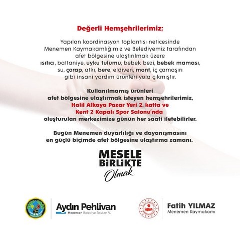 Menemen Belediye Başkan Vekili Aydın Pehlivan, haberi alır almaz kriz masası oluşturduklarını açıkladı. Devletin tüm imkanlarıyla deprem bölgesinde olduğunu belirten Pehlivan, “23 kişilik Menemen Belediyesi Arama Kurtarma (MAKUR) ekibimiz AFAD’ın talimat ve talepleri doğrultusunda deprem bölgesine giderek kurtarma çalışmalarına destek verecek. Menemen Kaymakamlığımız ile birlikte deprem bölgesinde soğuk hava şartları göz önüne alınarak acil ihtiyaçlar için gıda, kıyafet ve temizlik malzemeleri için de yardım kampanyası başlattık. Kampanyaya destek olmak isteyen hemşehrilerimiz, Halil Alkaya Pazar Yeri 2. Katta ve Egekent 2 Spor Salonu’nda oluşturulan merkezlerimize günün her saati yardımlarını iletebilir” diye konuştu.