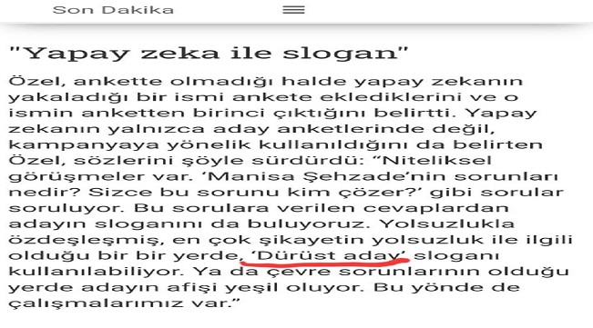 CHP’nin İzmir’de aday ve slogan belirlerken yapay zekaya sordukları soruların doğru olduğunu ama aldıkları yanıtların kendilerini işaret ettiğini göremediklerini belirten AK Parti İzmir İl Başkanı Bilal Saygılı, konuya ilişkin şunları söyledi; “Halka sorulası gerekeni, yapay zekaya sormuşlar. Hadi sordular, yapay zekâ mucizesini yok sayacak değiliz. Ama; aldıkları yolsuzluk şikâyeti olan yerlerle ilgili yanıtları hiç üstlerine alınmadan açıklama yapıyorlar. Maharetmiş gibi de “doğru-dürüst” sloganını buna göre belirlediklerini söylüyorlar. Şaka gibi gerçekten. Bu ne demek? Kendilerinin İzmir’i, Büyükşehir Belediye Başkan Adayları Cemil Tugay’ın son 5 yıl Karşıyaka’yı yönettiği yerde ‘yolsuzluk’ şikâyeti var demek. Doğru, Dürüst tarifine kendileri yüzünden ihtiyaç duymuşlar demek. Bu ne demek? Tugay’ın selefi Tunç Soyer, daha önceki başkanları Aziz Kocaoğlu ‘doğru-dürüst değildi’ demek. CHP’nin İzmir’de aynaya bakma alışkanlığı zaten hiç yoktu; yapay zekâ onlara acı gerçeği sunmuş, bu kez de üstlerine hiç alınmamışlar.
