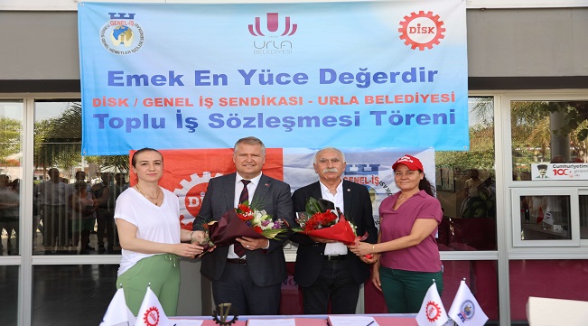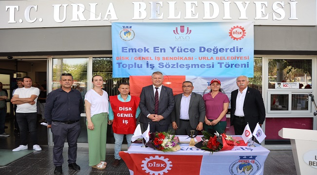 Urla Belediyesi ve DİSK 4 No’lu Şube arasında imzalanan toplu iş sözleşmesi ile kadrolu 55 işçi maaşlarına 1 Mart 2024 itibariyle günlük yevmiye tabanında yüzde 135 zam yapıldı. İmza töreninde konuşan Urla Belediye Başkanı Selçuk Balkan, İş barışının, dayanışmanın, iş birliğinin güzel bir örneği olan bu sözleşme ile işçimizi enflasyona ezdirmedik” dedi