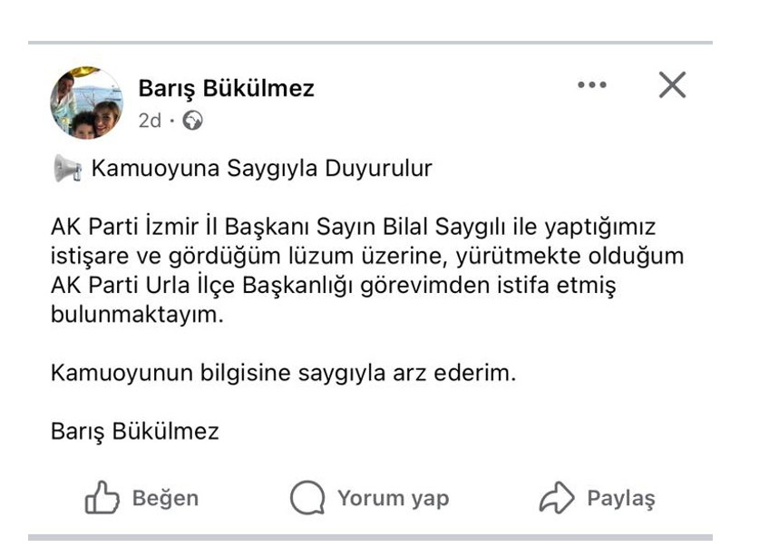“AK Parti İzmir İl Başkanı Sayın Bilal Saygılı ile yaptığımız istişare ve gördüğüm lüzum üzerine, yürütmekte olduğum AK Parti Urla İlçe Başkanlığı görevimden istifa etmiş bulunmaktayım.