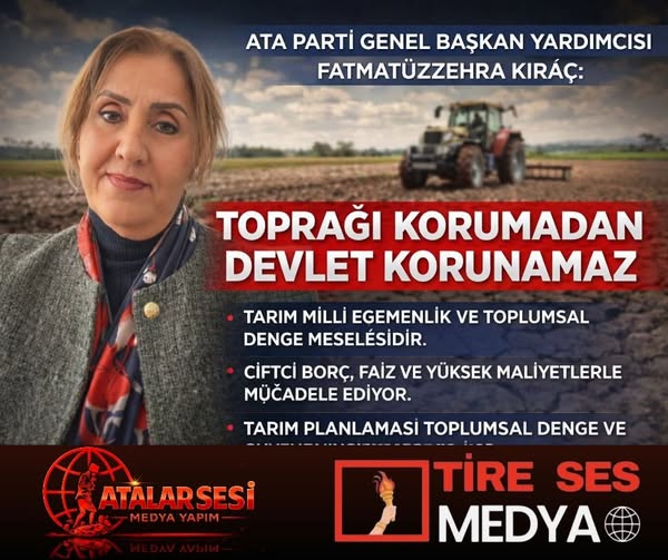 Fatımatüzzehra Kıraç, 2026 Türkiye’sinde tarım politikalarının yeniden ele alınması gerektiğini belirterek, tarımın yalnızca üretim alanı değil, milli egemenlik ve toplumsal denge meselesi olduğunu söyledi. ATA Parti Genel Başkan Yardımcısı Kıraç,..
