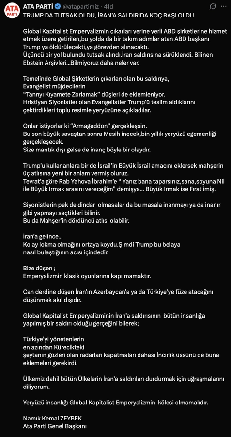 Ata Parti lideri Zeybek’ten çarpıcı Trump iddiası: “Tutsak edildi, İran saldırısına sürüklendi” Ata Parti Genel Başkanı Namık Kemal Zeybek, ABD Başkanı Trump’ın “tutsak edildiğini” ve İran saldırısına zorlandığını öne sürdü…