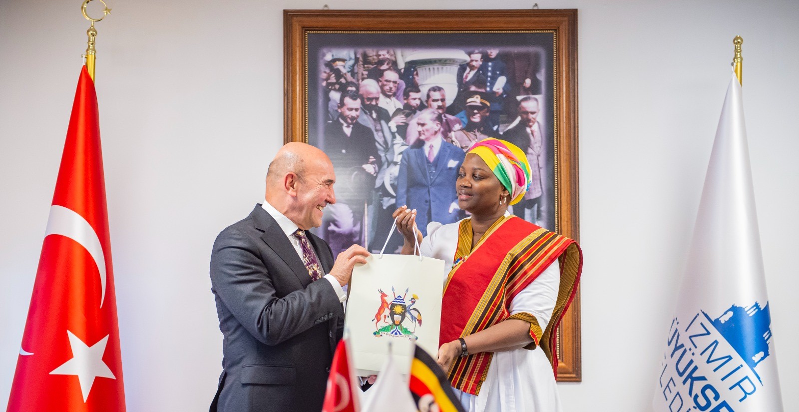 Uganda’nın Ankara Büyükelçisi Nusura Tiperu, İzmir ile Uganda arasında işbirliği olanaklarının geliştirilmesi için İzmir Büyükşehir Belediye Başkanı Tunç Soyer’i ziyaret etti. Fuar İzmir’deki başkanlık ofisinde yapılan görüşmede Nusura Tiperu, Uganda ve İzmir arasında bağ kurulmasının önemine değindi. Büyükşehir belediye başkanlarının karşılıklı ziyaretlerinin de etkili olacağını ifade eden Büyükelçi, bölgedeki Türk yatırımlarını anlattı.