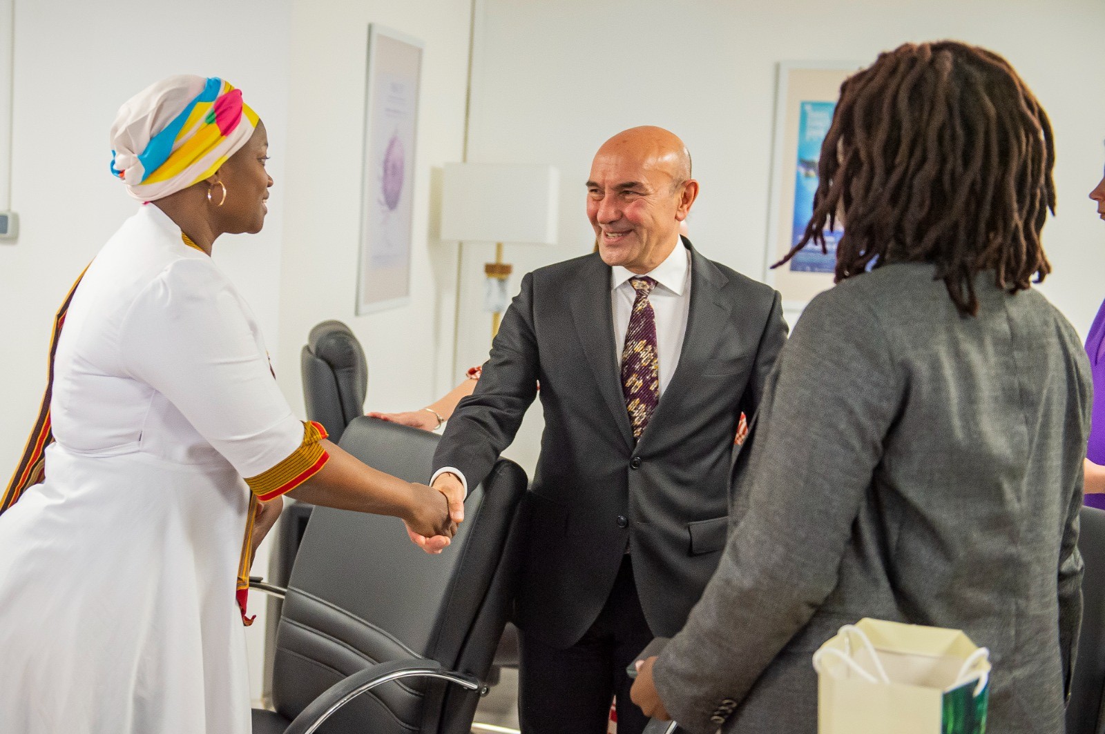 İzmir Büyükşehir Belediye Başkanı Tunç Soyer, Uganda’nın Ankara Büyükelçisi Nusura Tiperu’yu ağırladı. Fuar İzmir’deki görüşmede iki ülke arasındaki ticari, ekonomik ve kültürel ilişkilerin geliştirilmesi için atılması gereken adımlar konuşuldu.